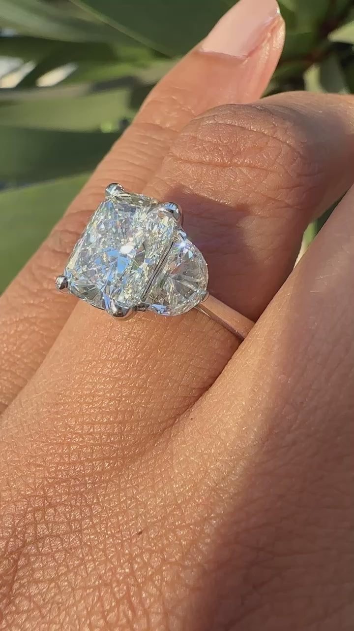 A timeless three-stone ring featuring a brilliant cushion cut center diamond and two matching side stones. Set in a classic prong setting for maximum sparkle.
