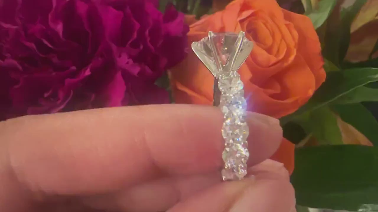 Timeless brilliance meets bold elegance. This solitaire features a stunning lab-grown round diamond in a six- prong setting, surrounded by matching side stones for a seamless, radiant look.