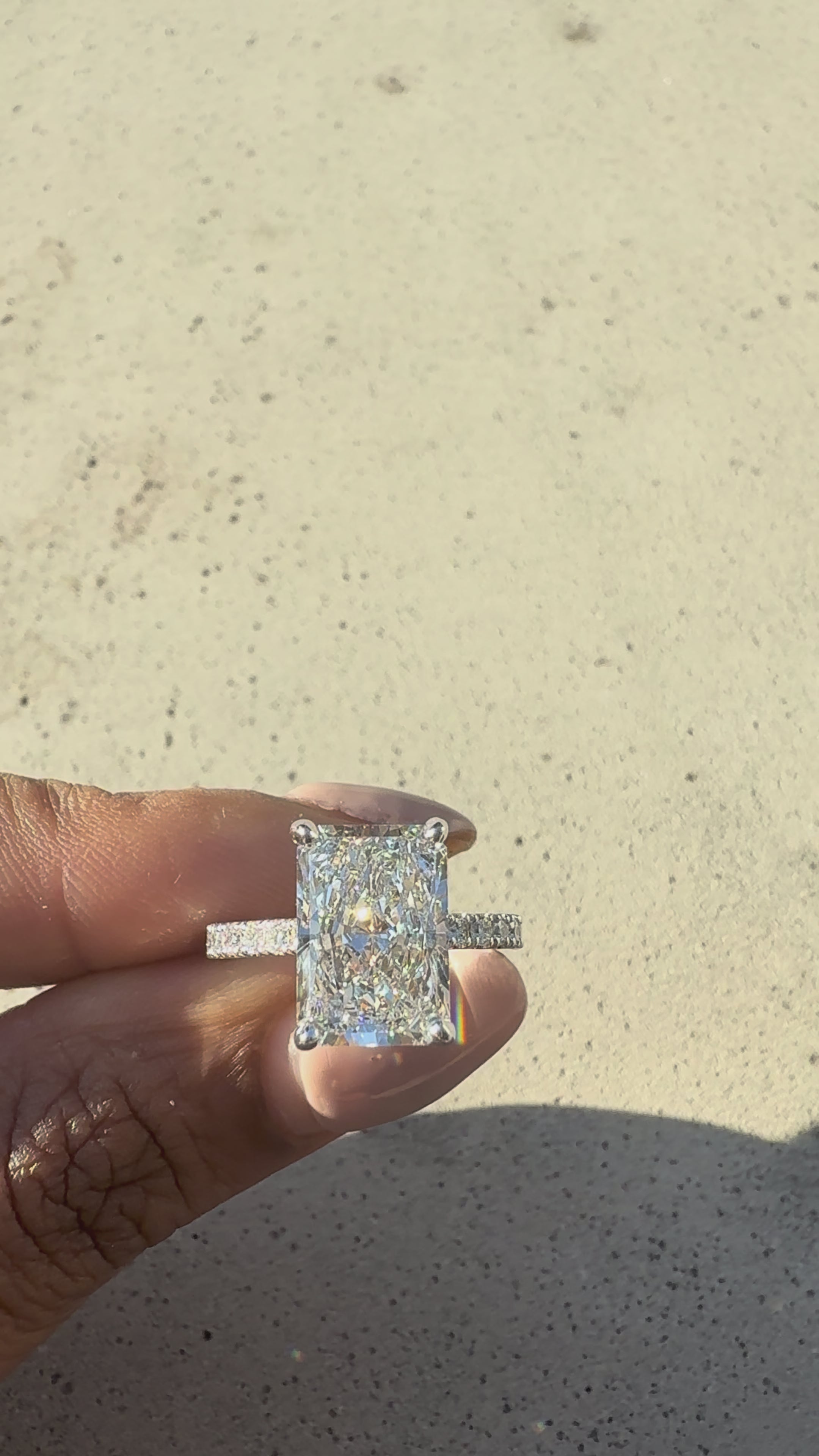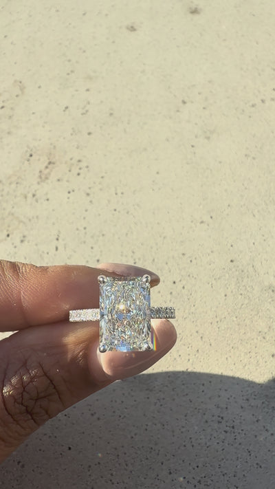 This Radiant Cut lab-grown diamond engagement ring features a brilliant 5.00ct IGI-certified center stone set in a secure prong setting, complemented by 0.25ct of side stones & a hidden halo for added sparkle. Crafted with 100% conflict-free diamonds and fine gold.