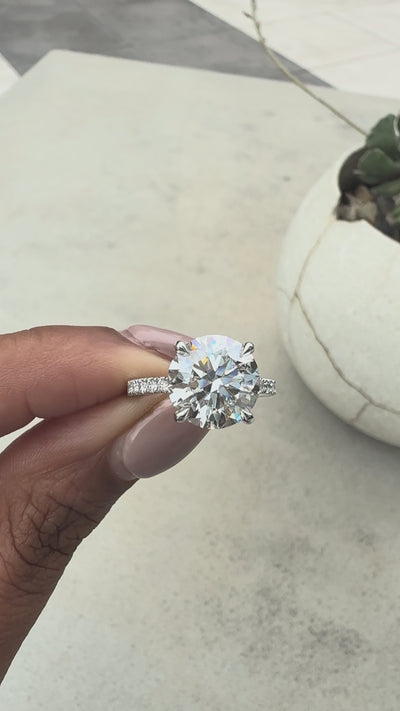 This round lab-grown diamond engagement ring features a brilliant 4.00ct IGI-certified center stone set in a secure prong setting, complemented by 0.25ct of side stones & a hidden halo for added sparkle. Crafted with 100% conflict-free diamonds and fine gold.